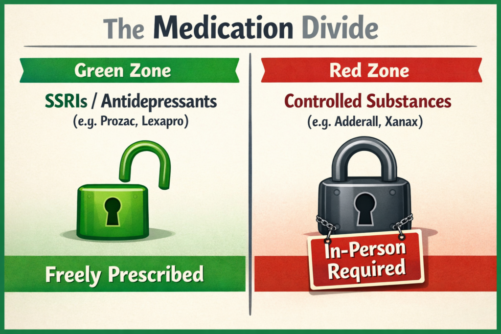 You don’t need a therapy session; you just need a refill to bridge the gap. Can Telehealth (Urgent Care) help? Yes, but you must know the rules.